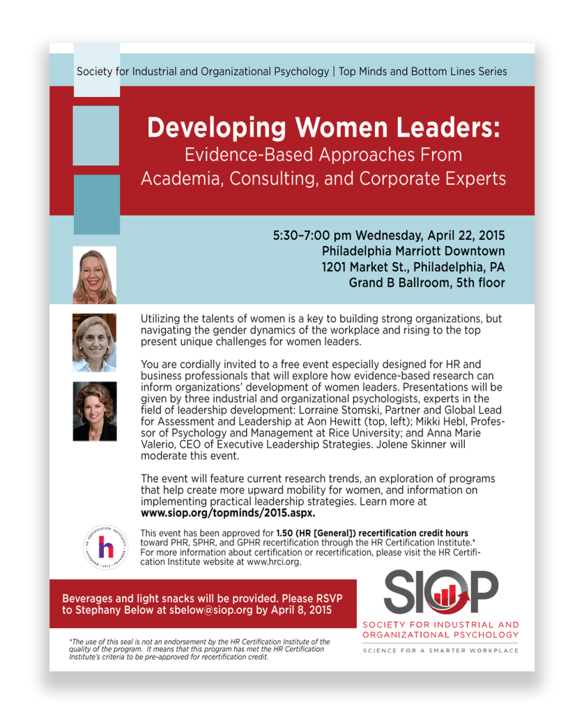The TMBL event series presented a new event twice per year, with a unique topic and speakers, on location at our spring annual conferences and fall Leading Edge Consortia. We leveraged the fact that our high-level members would already be attending the SIOP conference/consortium and thus available to speak at TMBL. We also partnered with local universities and organizations for event space and assistance with promotion. We were also able to submit for and obtain continuing education credit hours for these events through the HR Certification Institute, offering more value to attendees.